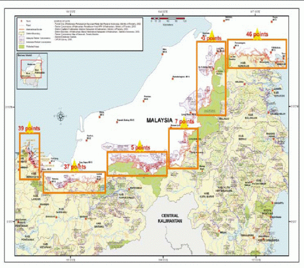The routes of  illegal timber smuggling from Kalimantan, Indonesia to Sarawak, Sabah, Malaysia, NGOs and Indonesian Government took to stop many area-カリマンタン(インドネシア)からサラワク、サバ州への密輸ルート・・・NGOsやインドネシア政府の行動で多くの箇所で違法取引が停止した。