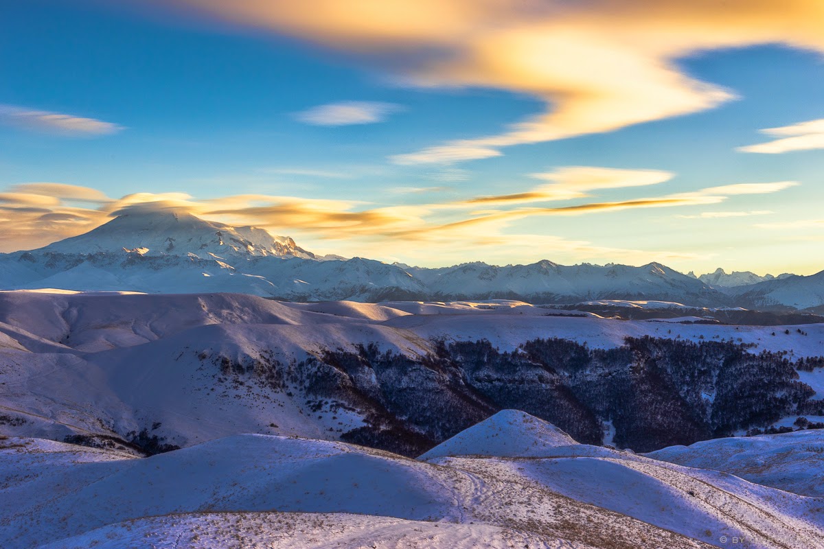 Снято неподалеку от перевала Гумбаши, на закате очень быстро над Эльбрусом сформировалось лентикулярное облако, не переминувшее зажечься от закатного солнца.